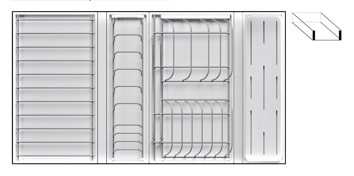 Модель — 1 большой модуль для посуды + 1 большой модуль с решеткой + 1 малый модуль для посуды + модуль для столовых приборов