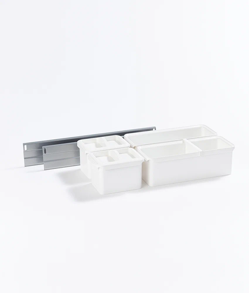 Набор емкостей №3 Юбокс, Диспенса / Диспенса Джуниор 300 мм, 2хбокса 1л., 2хбокса 2.1 л., 1хделитель, 2хкрышки, цвет Титан / емкости Белые