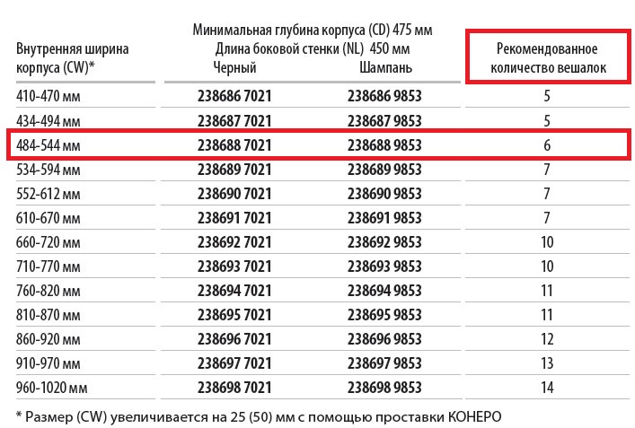 Размер (CW) увеличивается на 25 (50) мм с помощью проставки КОНЕРО