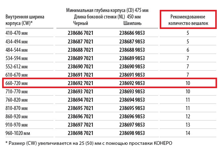 Размер (CW) увеличивается на 25 (50) мм с помощью проставки КОНЕРО