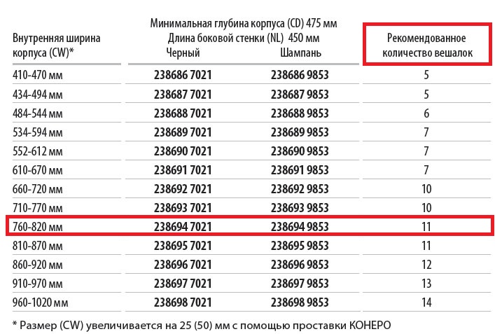 Размер (CW) увеличивается на 25 (50) мм с помощью проставки КОНЕРО