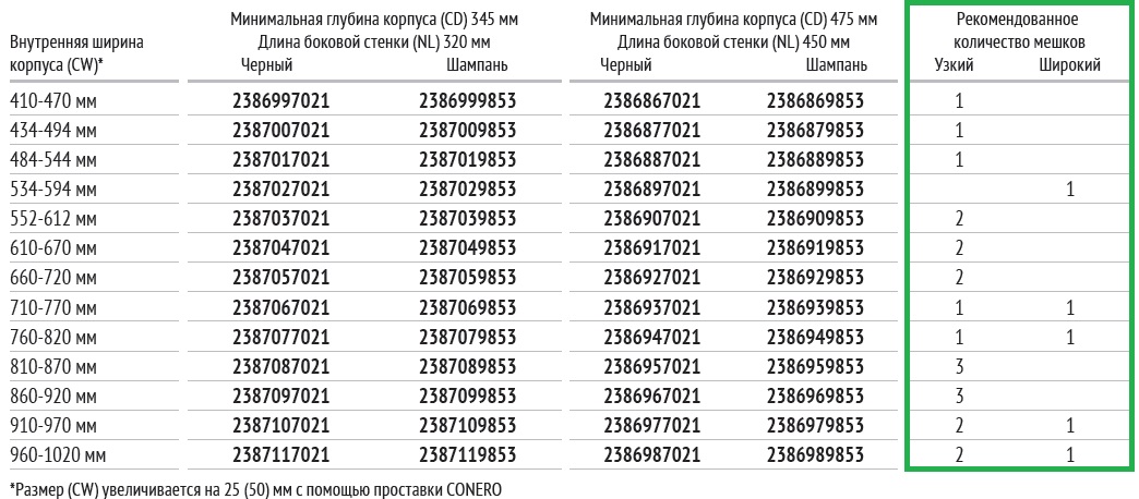 Рекомендованное количество мешков для выдвижных рам-держателей см. в галерее.