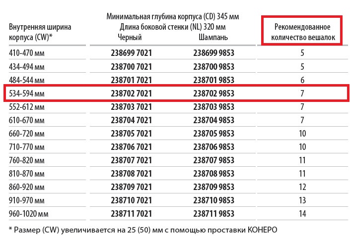 Размер (CW) увеличивается на 25 (50) мм с помощью проставки КОНЕРО