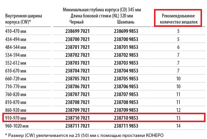 Размер (CW) увеличивается на 25 (50) мм с помощью проставки КОНЕРО