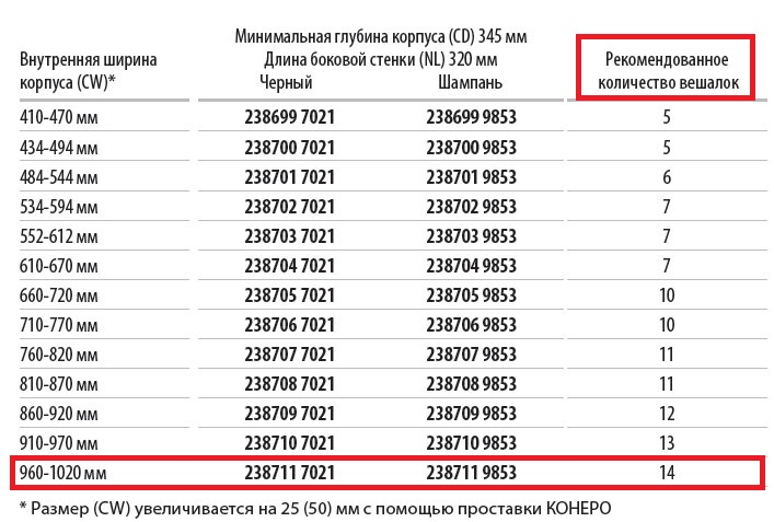Размер (CW) увеличивается на 25 (50) мм с помощью проставки КОНЕРО