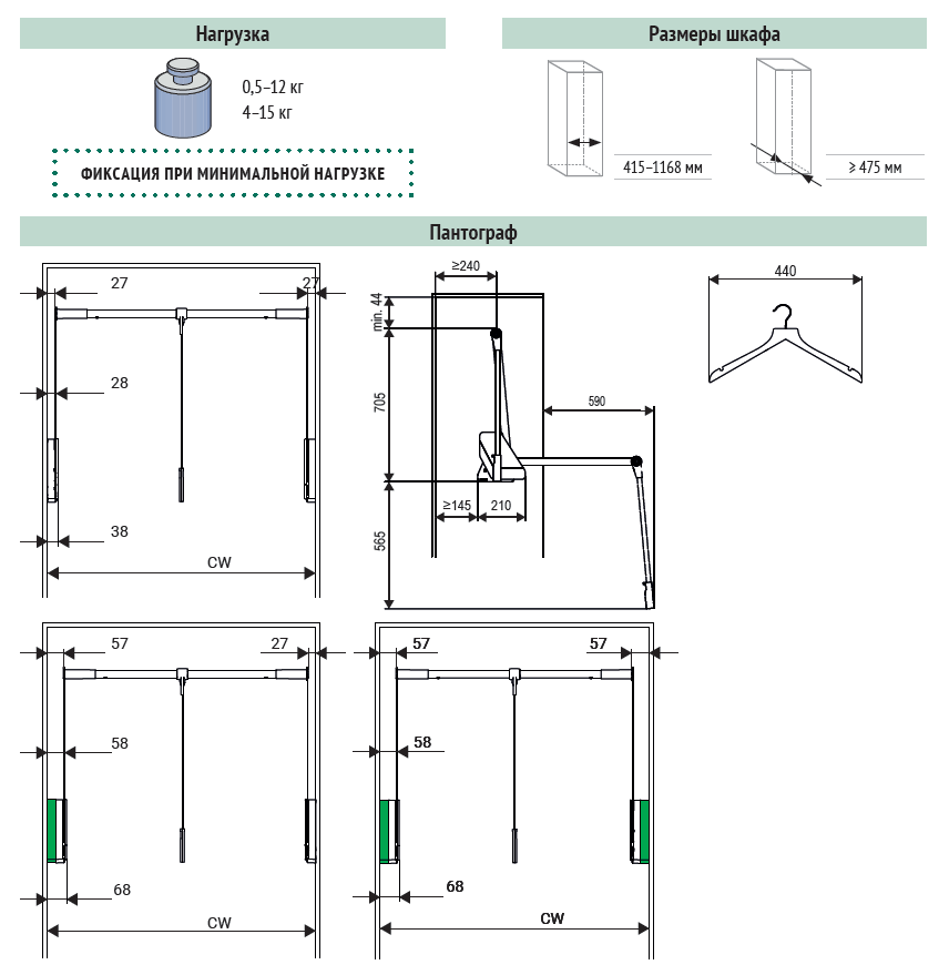 Общая нагрузка на механизм включает в себя: полезная нагрузка + собственный вес механизма 2 кг (максимальный вес ручки-тяги и штанги для одежды).