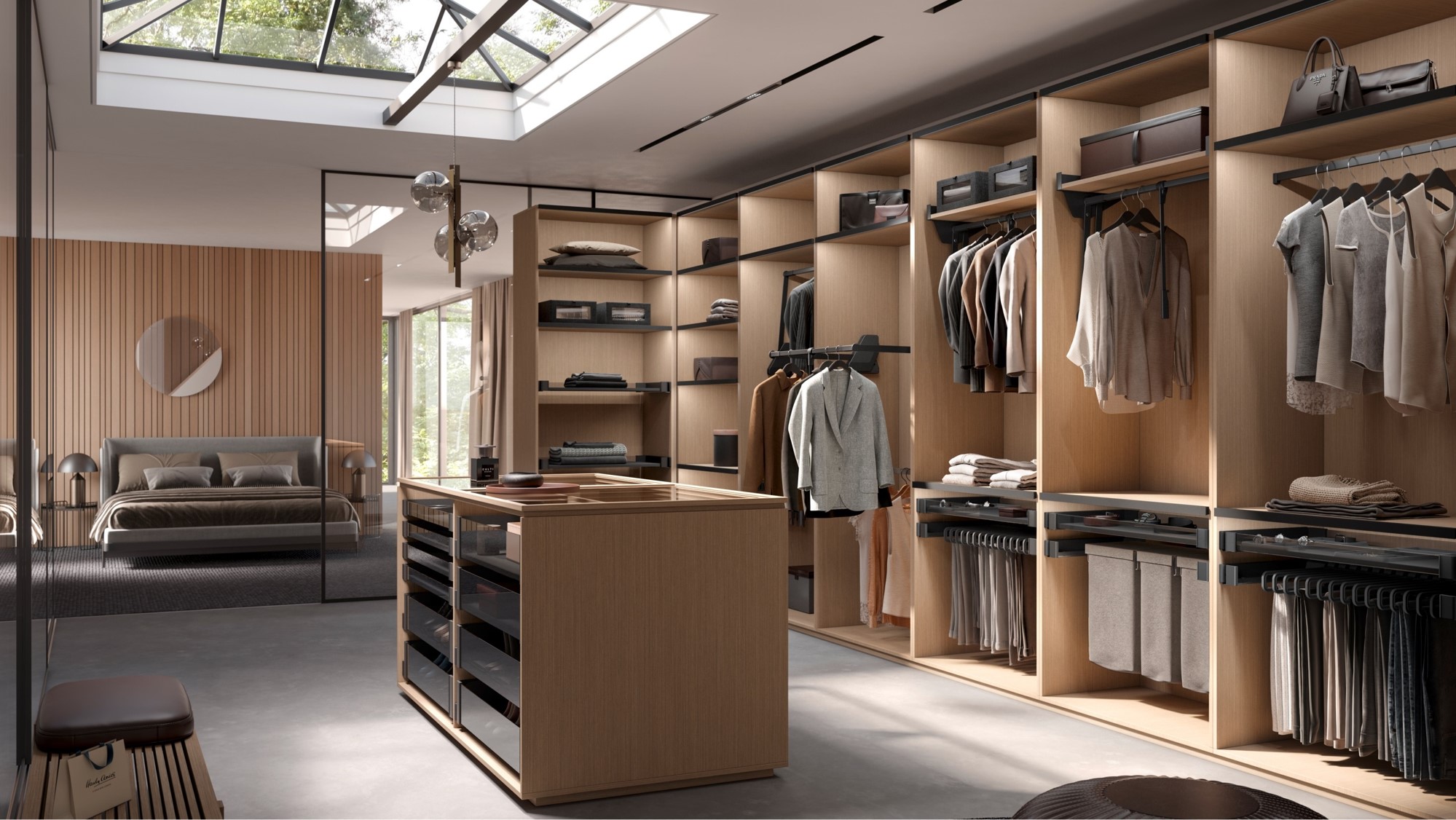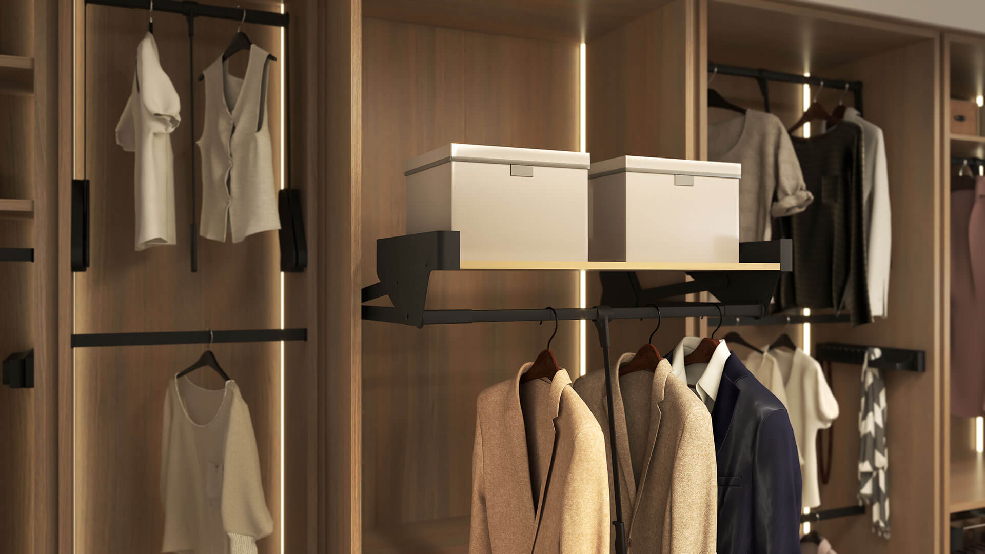 Система хранения Конеро от Kesseböhmer — комплексное решение, которое включает в себя все, что нужно для создания функциональных гардеробных и шкафов-купе: полки, пантографы, штанги, брючницы, держатели для ремней и галстуков, а также наполнение для хранения ювелирных изделий.