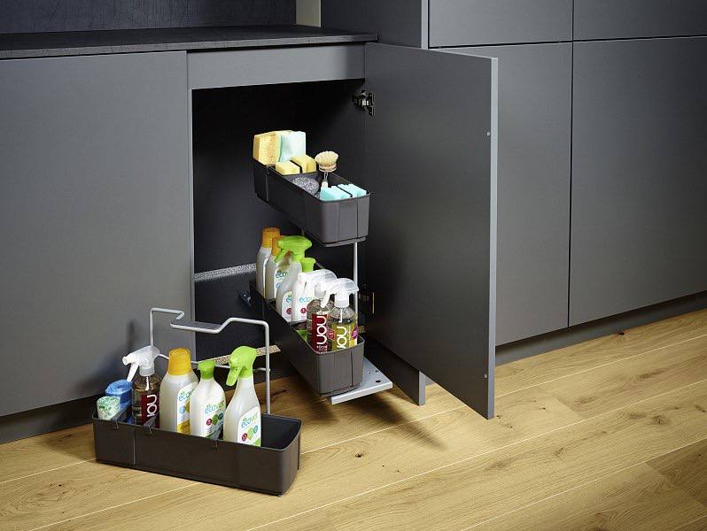 Клининг Агент - выдвижной модульный механизм для хранения чистящих средств и принадлежностей для уборки.
