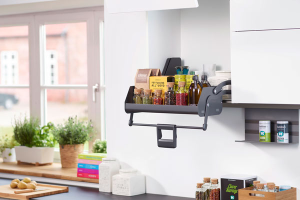 iMOVE заменяет собой вторую и третью полки в верхних шкафах. Механизм плавно перемещается в зону удобного обзора и надежно фиксируется в этом положении. В сложенном состонии пространство под ним остается свободным: здесь можно хранить более тяжелые предметы.